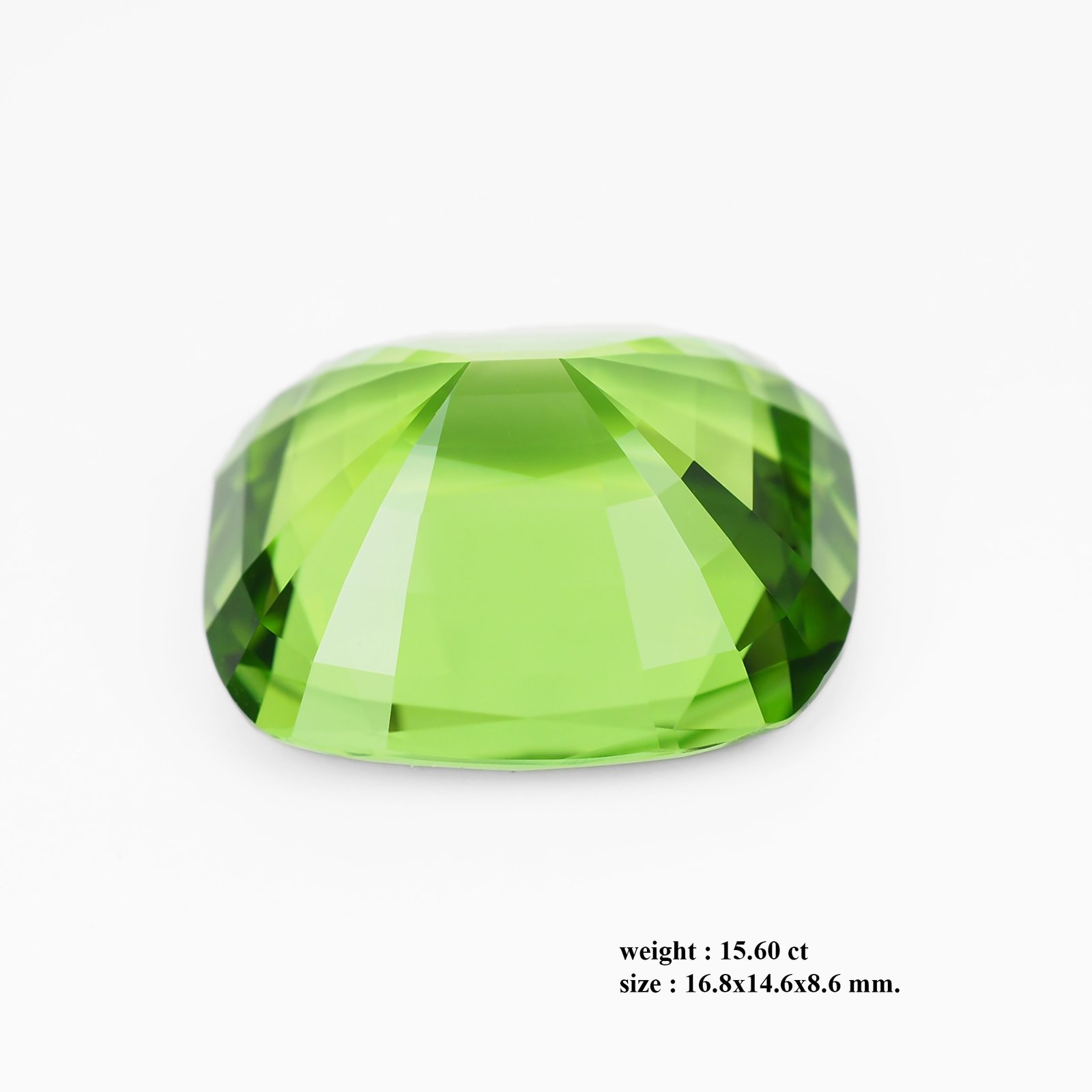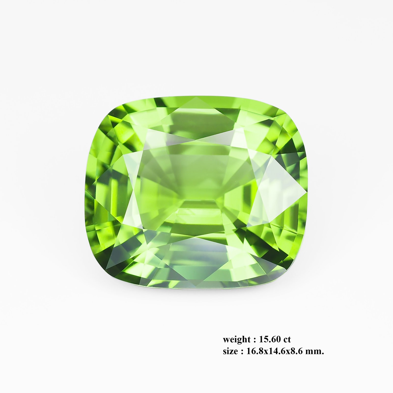 Apple Green 15.60 ct Natural Mogok Peridot (Burma) in a brilliant cushion with loupe-clean clarity, measuring 16.8 × 14.6 × 8.6 mm. Rich color, sharp facets, and strong fire. Provenance adds value; ideal focal point for a pendant.