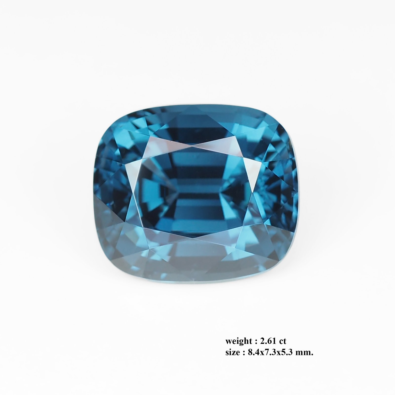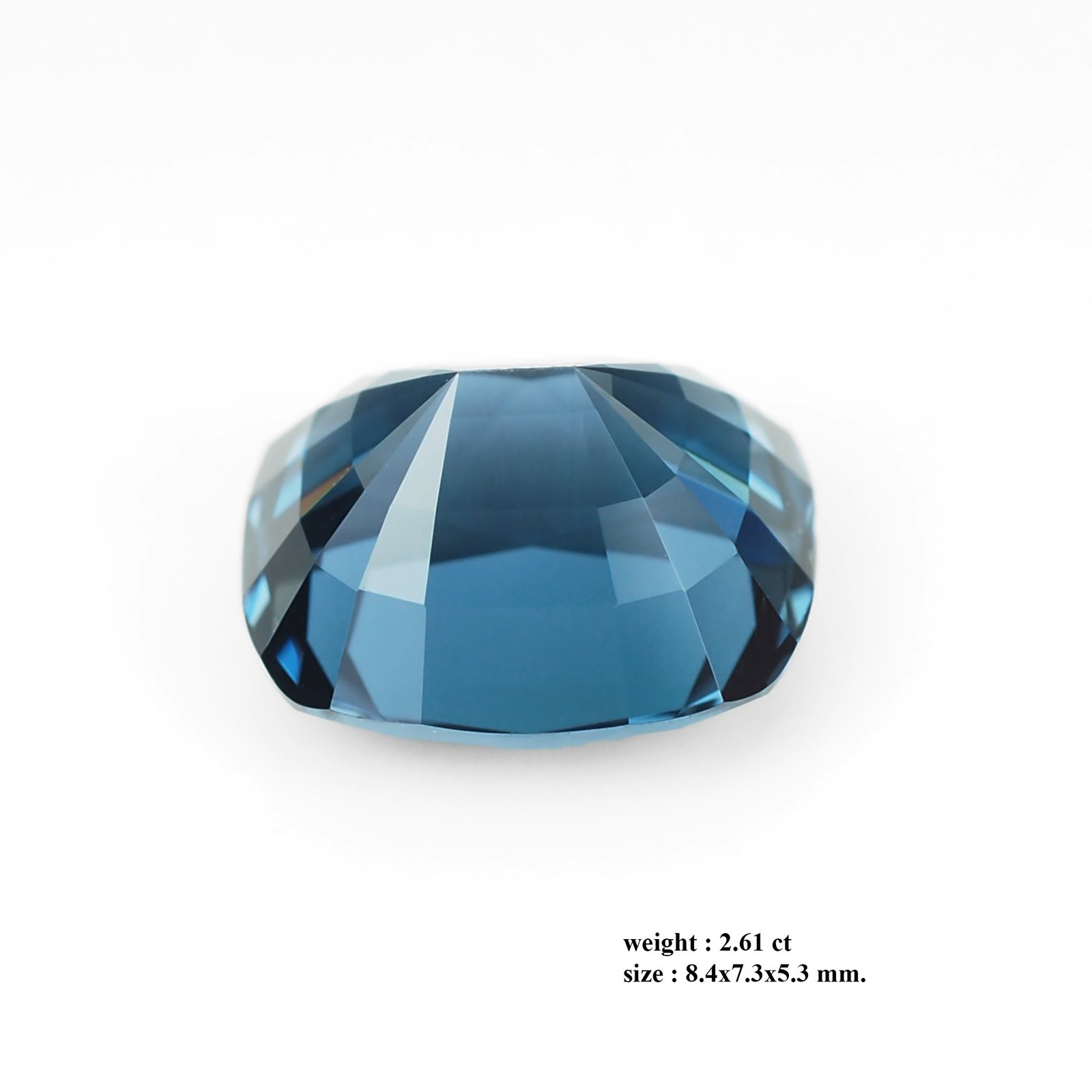 This stunning gemstone captures the essence of a tranquil midnight ocean. Weighing 2.61 carats and measuring (8.4 × 7.3 × 5.3) mm, its rich, saturated blue hues fade into luminous aquamarine facets, creating a captivating play of light that invites closer inspection. Cut with a precise cushion silhouette and an intricate facetwork, the gem maximizes brilliance and fire, delivering a refined glow that feels timeless yet contemporary. It presents a balanced profile and a graceful presence—perfect as a centerpiece for luxury jewelry.urns**