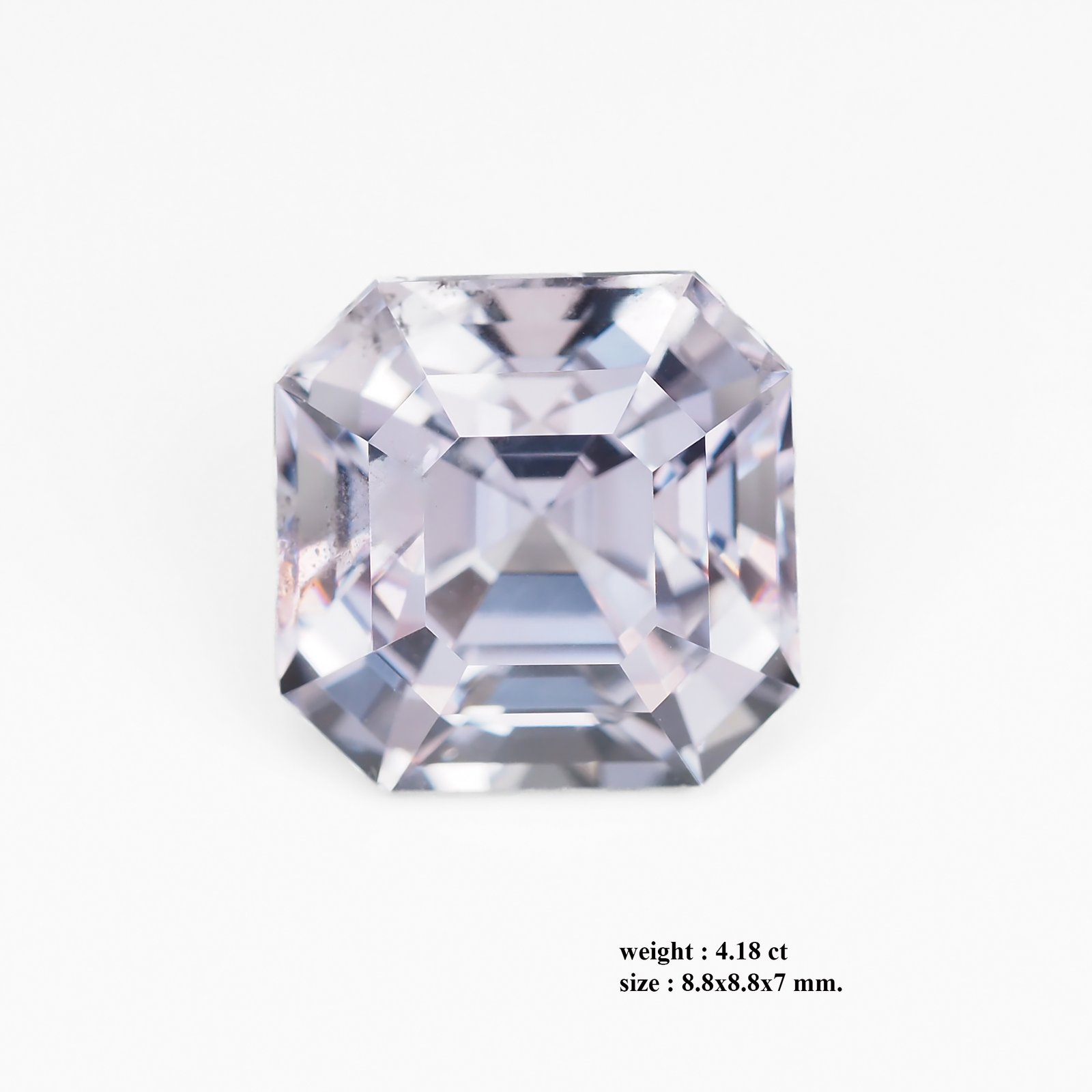 Natural no-heat Burma spinel, 4.18 ct, 8.8 × 8.8 × 7.0 mm, octagonal cushion cut. Orchid-tinged overtones with pearly flashes create a timeless, serene glow—perfect as a centerpiece or commemorative engagement piece, finished with cool, glass-like transparency that stays glamorous yet understated.