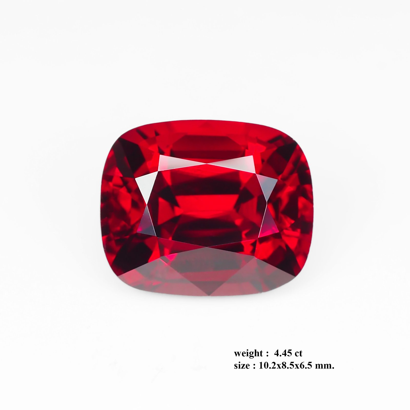 ComparePresenting a stunning 4.45 ct cushion-brilliant spinel from Burma, radiating a saturated **super red** hue reminiscent of pigeon’s blood. Measuring 10.2 × 8.5 × 6.5 mm, its expertly faceted cushion shape maximizes both brilliance and “hall-of-mirrors” reflections, revealing flashes of deep red fire under every angle. Perfect for a show-stopping ring, pendant, or custom heirloom piece, this spinel is completely natural and unheated—no color treatments or enhancements.