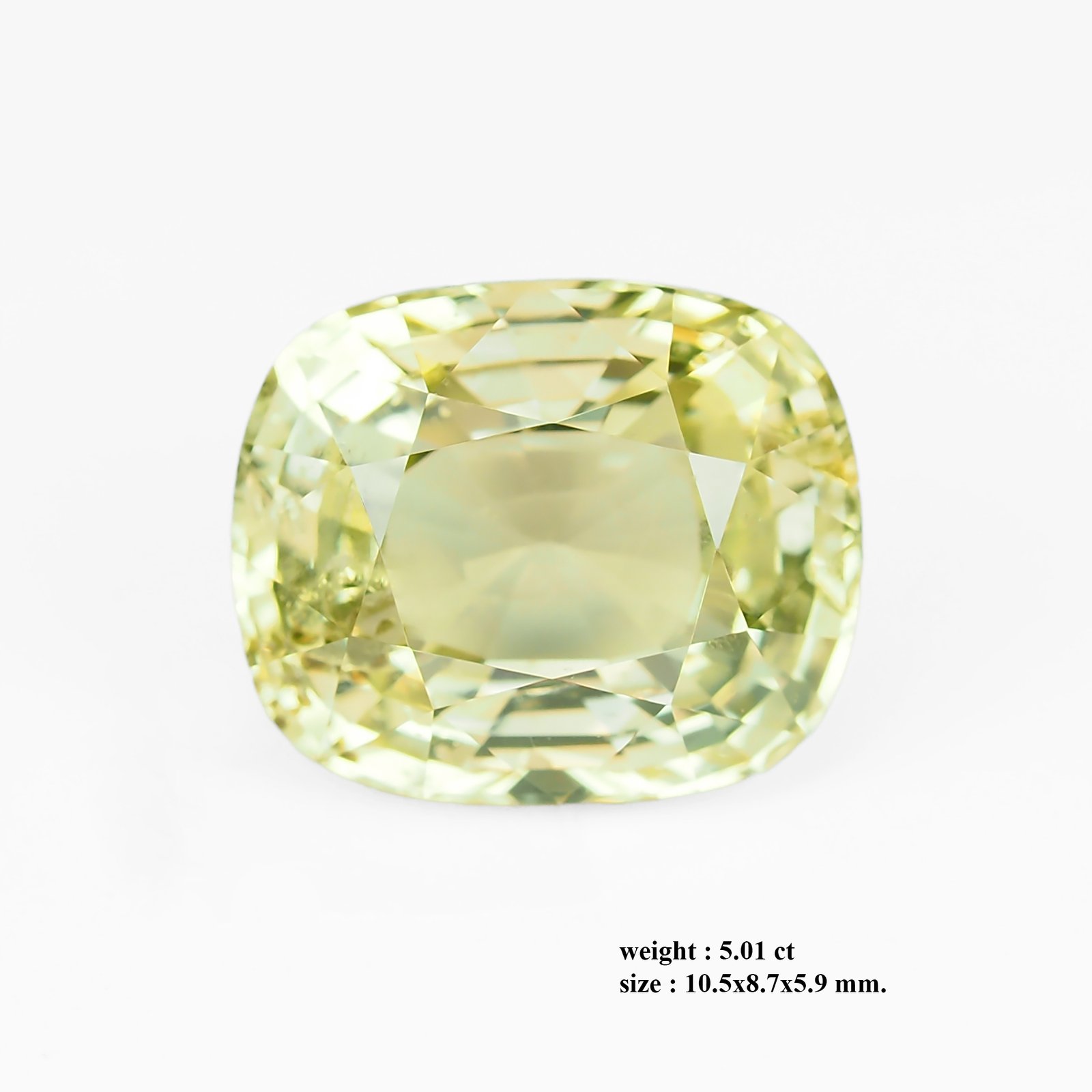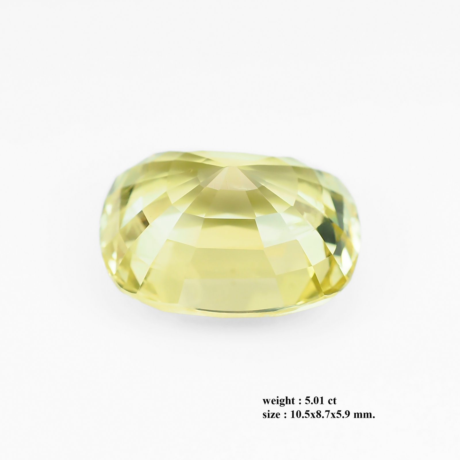 This exquisite no-heat Burma Mogok yellow sapphire weighs 5.01 ct and measures 10.5 × 8.7 × 5.9 mm, presenting a balanced cushion-to-oval silhouette that highlights its generous face-up area. Its cushion-cut facets release a warm, sunlit glow with lively fire across the stone, while its eye-clean clarity remains visually pristine. The no-heat treatment preserves its natural character and value. The stone’s natural origin from the famed Mogok mines adds cultural and geological significance, making it a distinctive centerpiece for vintage-inspired or modern jewelry. This is an authentic natural Myanmar Sapphire worthy of your investment and collection.