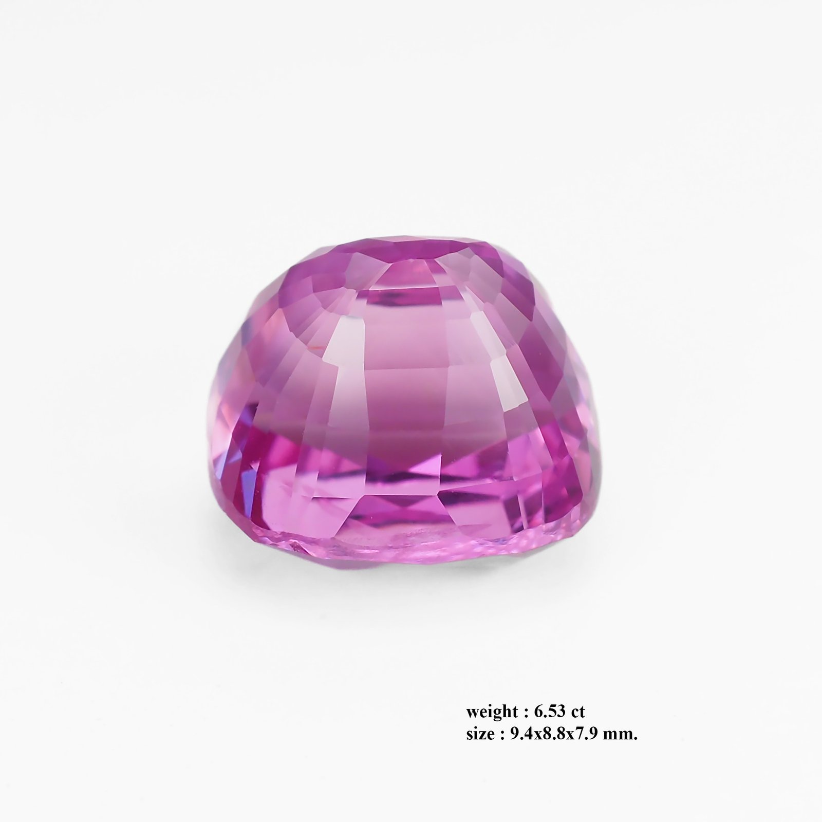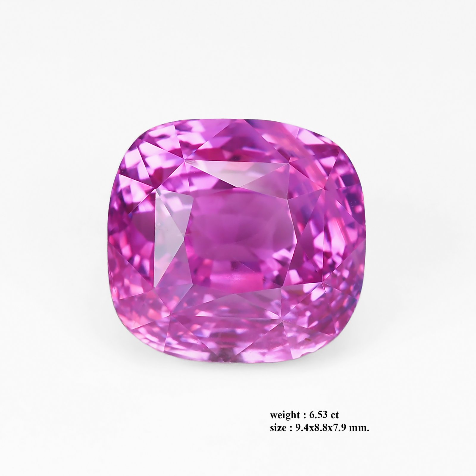 This exquisite 6.53-carat Sri Lanka Pink Sapphire is a naturally perfect gemstone, boasting a rare and highly saturated Intense Pink color. The stone is certified as completely natural and unheated, greatly enhancing its collector value. Its generous size, measuring 9.4×8.8×7.9 mm, is expertly shaped into a Brilliant Cushion cut to maximize light performance, beautifully highlighting its pristine Eyes Clean clarity. This rare combination of significant weight, vivid color, and untouched origin makes it an exceptional, high-value gem.