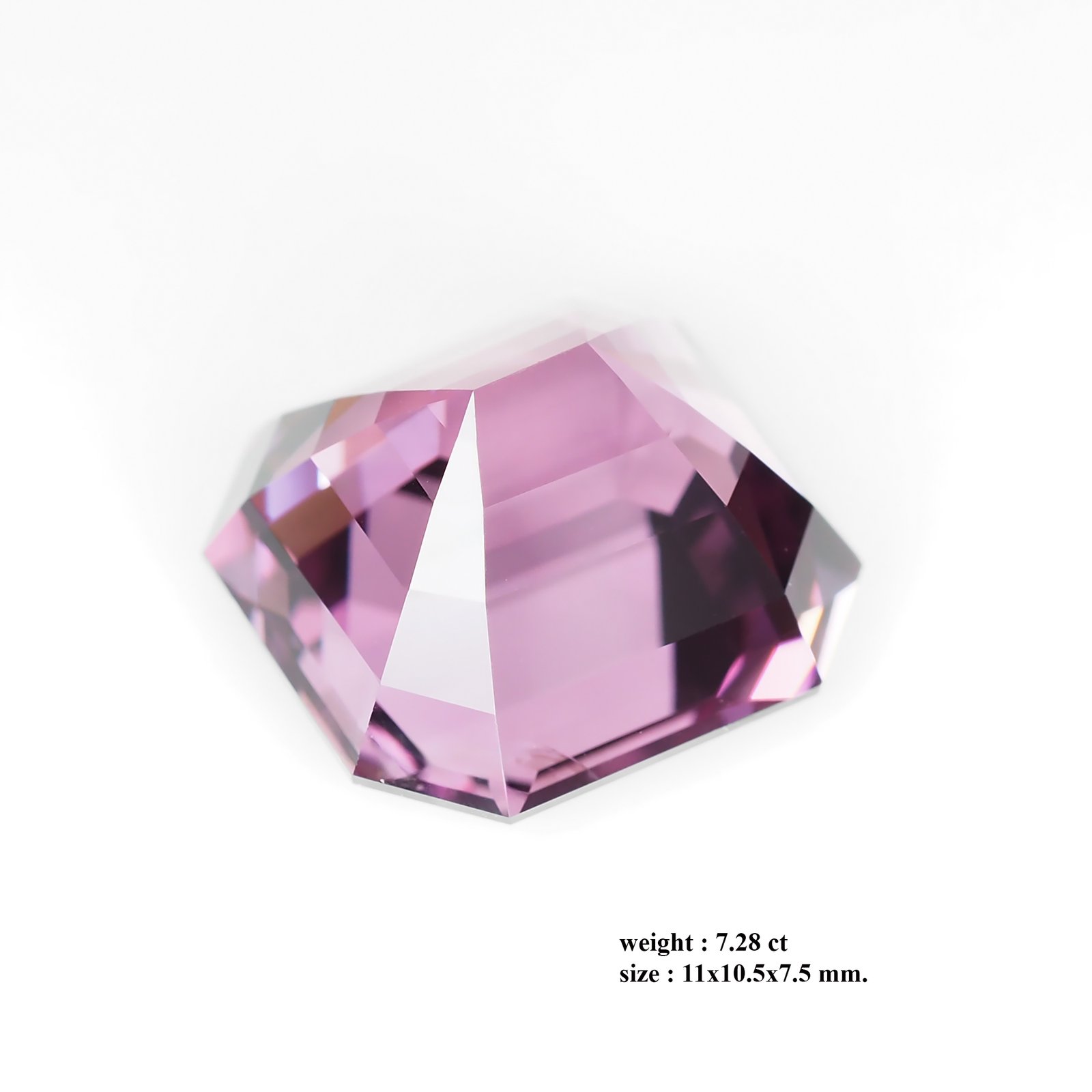 The Burma natural spinel unfolds like a lotus in full bloom—its violet-pink charisma rising from still waters. Emerald-cut facets ripple outward, each plane a petal catching light and releasing it in delicate, layered calm. Weighing 7.28 carats and measuring 11 x 10.5 x 7.5 mm, it rests with serene balance, a graceful sculpture of color and clarity. Its inner glow breathes with tranquil intensity, a timeless bloom that exudes elegance, poise, and natural grace.