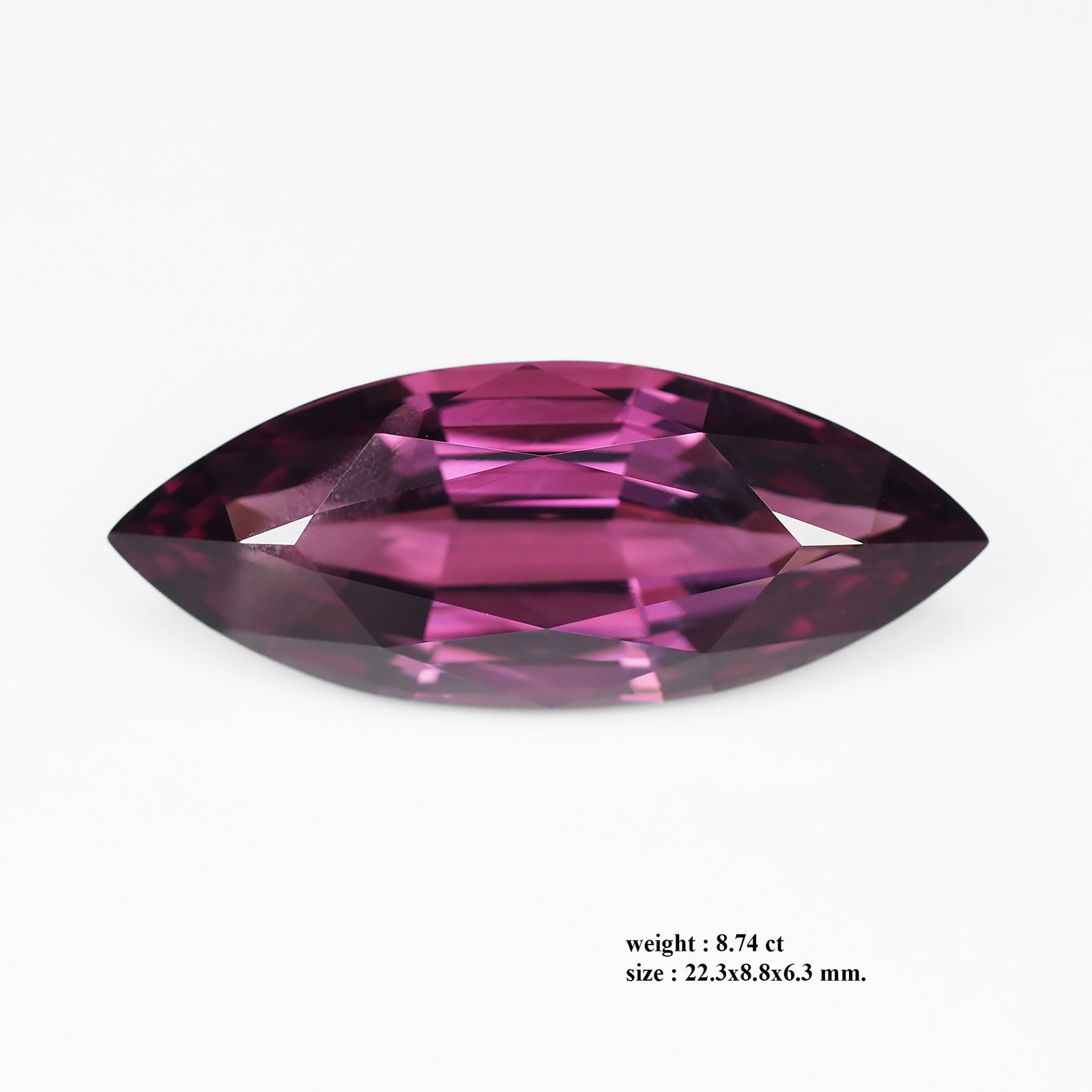 Velvet cherry brilliance: a natural Burma spinel whose deep magenta glow and crafted in a classic marquise cut, the gem showcases precise symmetry and exceptional brilliance, with a deep magenta core that settles into brighter cherry tones along the pavilion as light dances across its facets. Its rich, opulent hue is complemented by a generous 8.74 carat weight and a balanced 22.3 × 8.8 × 6.3 mm proportions, delivering a commanding presence ideal for a statement ring, heirloom pendant, or couture centerpiece. A true embodiment of elegance, timeless prestige, and the lush allure of premium gemstone craft.